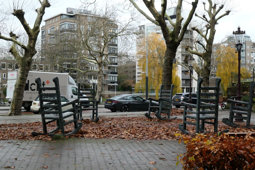 Tenslotte gingen we naar Ernst in de Pieter Vlamingstraat. Ernst liet ons zien hoe hij 's morgens uit het raam kijkt en de zon ziet reflecteren in de flats aan de overkant. Hij geniet hier heel erg van. En voor zijn deur is het stoelen kunstproject waar voorbijgangers altijd wel even op gaan zitten.
