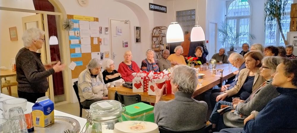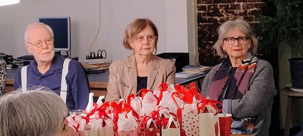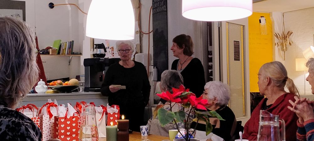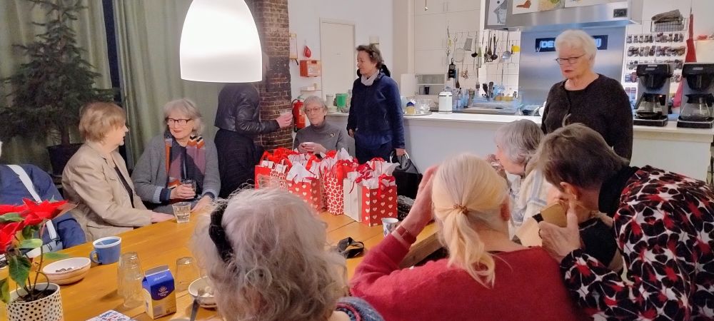 Marian Dekker, onze voorzitter, opende deze feestelijke bijeenkomst met een kort relaas over de vele avonturen die ons hernieuwde bestuur had getrotseerd (Kamer van koophandel en Bank, de Website en de Nieuwsbrief, het vergaderlokaal en nog zo veel meer) en dankte allen, maar speciaal enkele Kerngroepleden en Activiteiten-begeleiders met een attentie. Speciale aandacht voor Angelie Weber, weliswaar geen Kerngroeplid meer, maar super-actief als “gewoon” lid. Dit “Jaaroverzicht” werd afgesloten met een sprankelend wijntje en een toast op het nieuwe jaar.