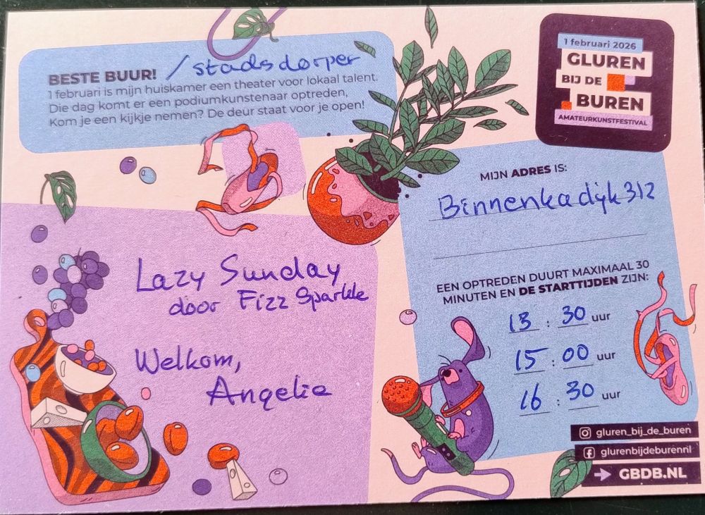 Bij Angelie kunnen max 15 mensen binnen. Fizz treedt drie keer een half uur op, om 13.30, 15.00 en 16.30 uur. Vol is vol dus kom op tijd.